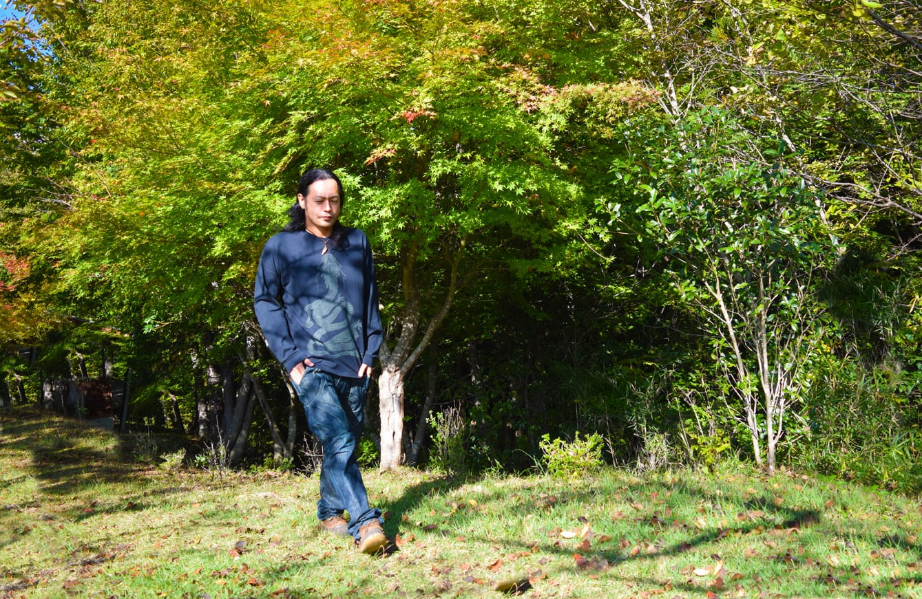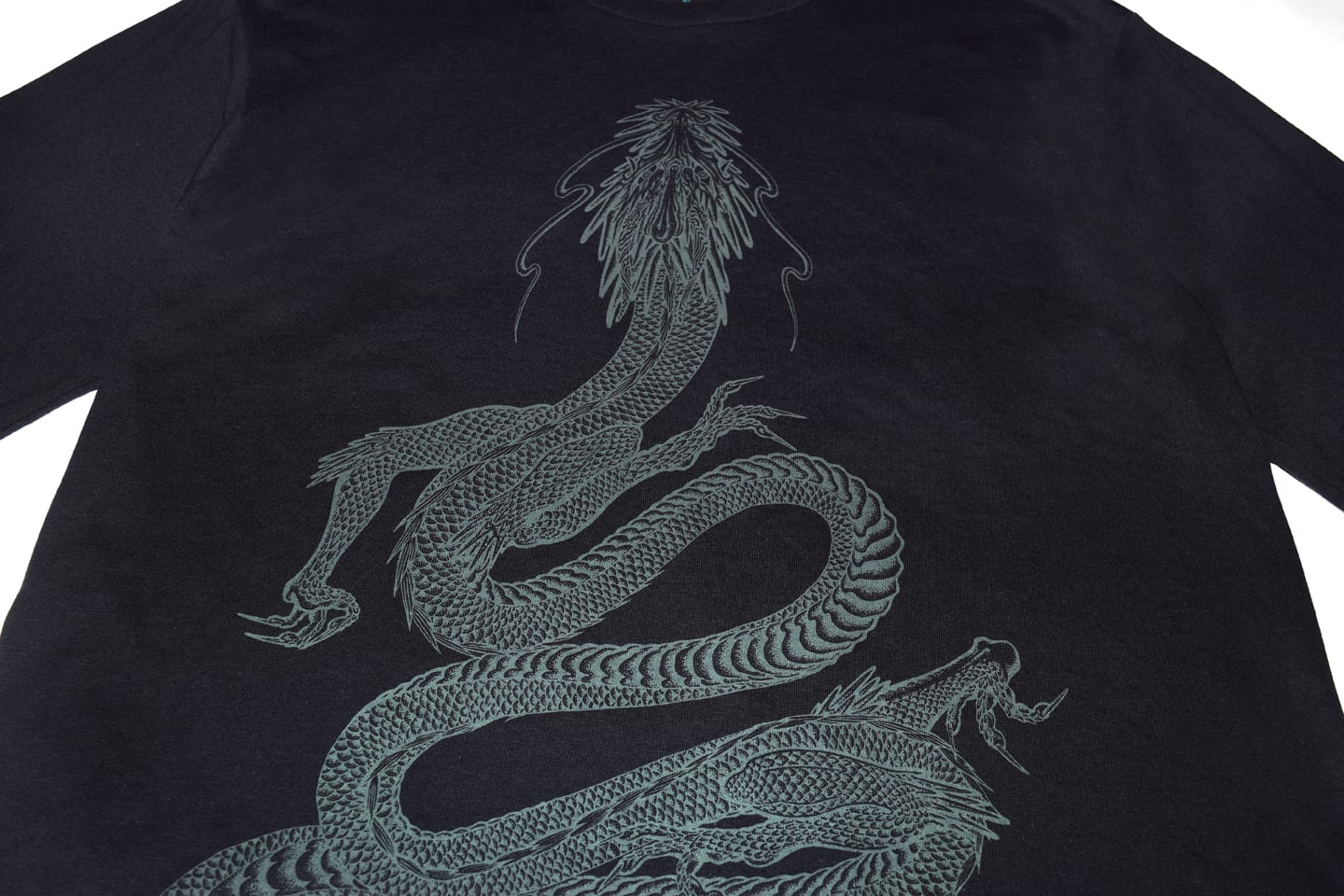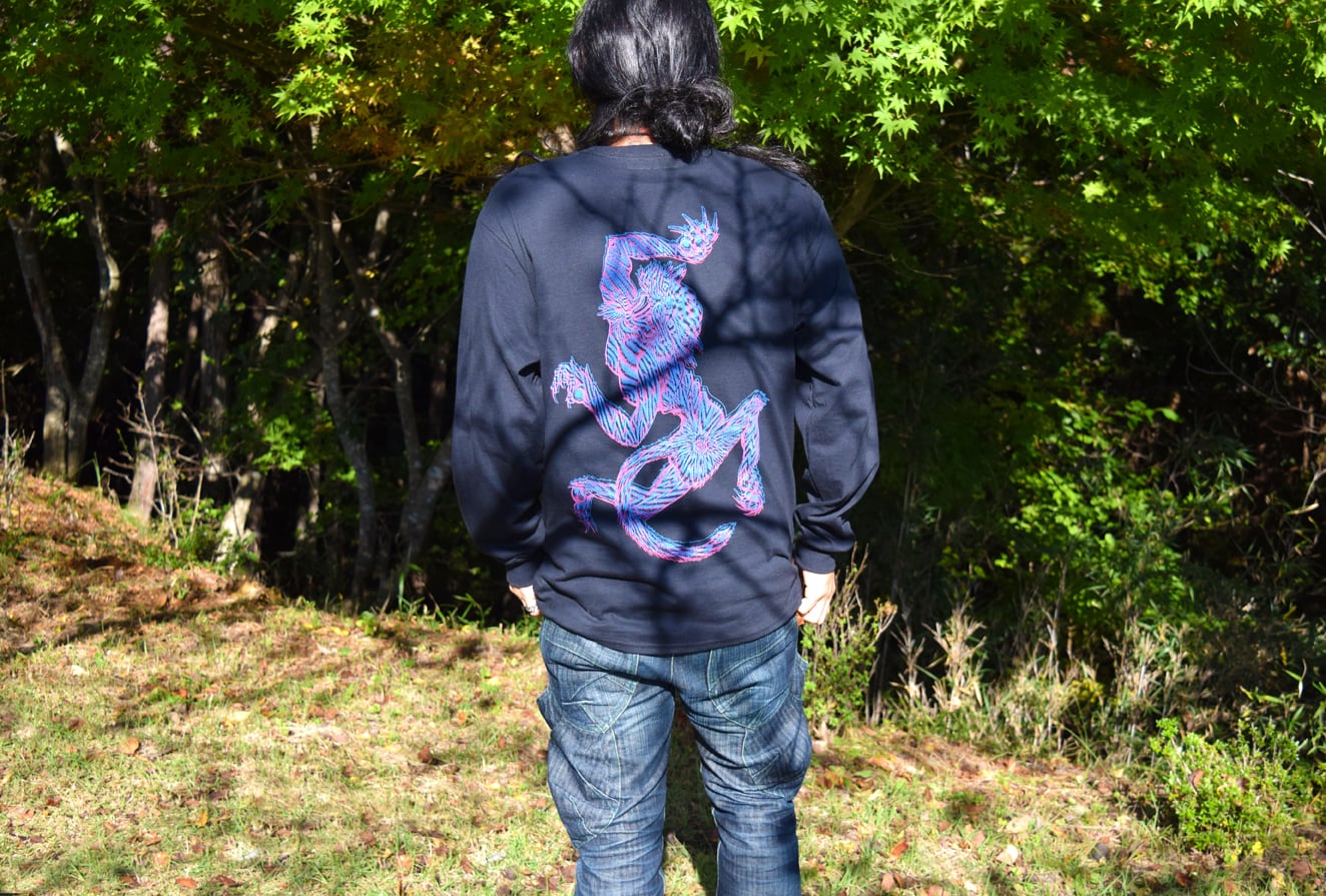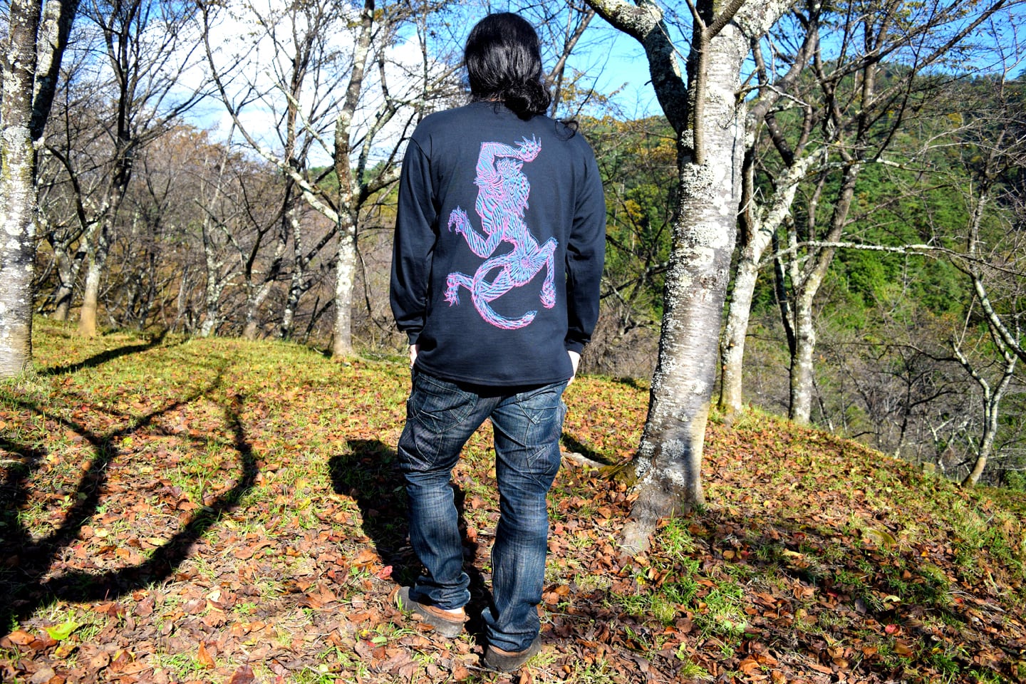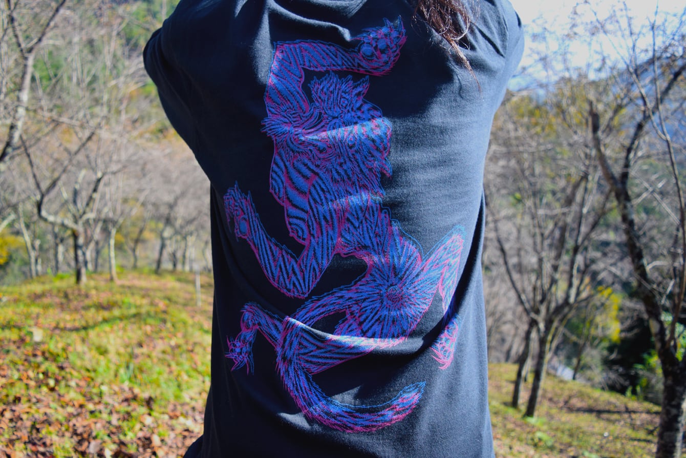 Front龍 ダークモスグリーンで細密画昇龍を引き立て、Back虎 パッションなピンク&ブルーは、ごきげんなカラーインパクトで威圧を現わします。
