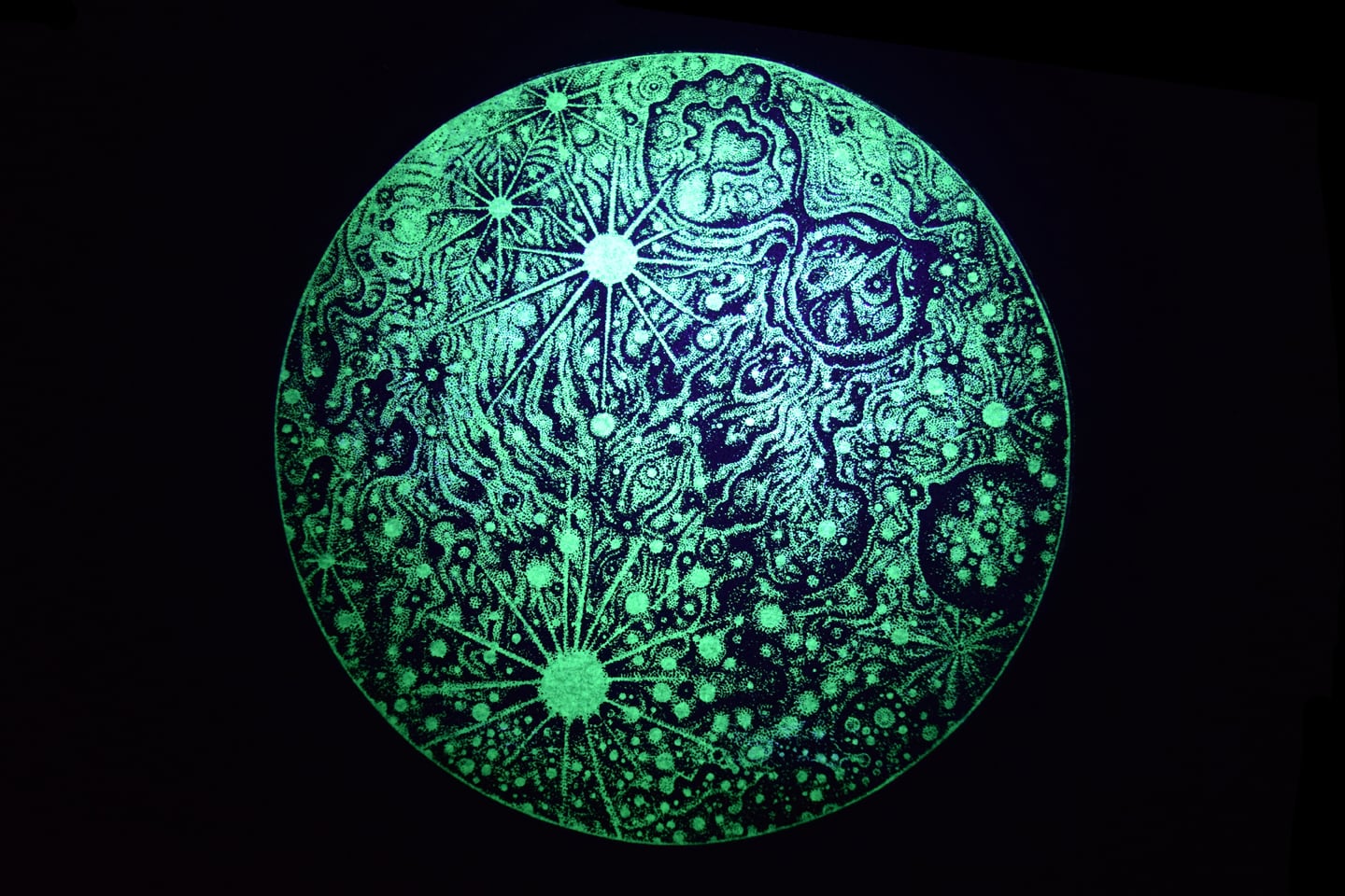 発光の強い蓄光インク採用。光から闇へ入ると発色致します。ブラックライトにも強烈に対応致します。